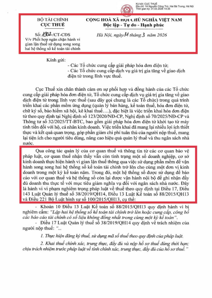 Ngày 31/3/2026, Cục Thuế ban hành công văn số 1902/CT-CĐS về Phối hợp ngăn chặn hành vi gian lận thuế