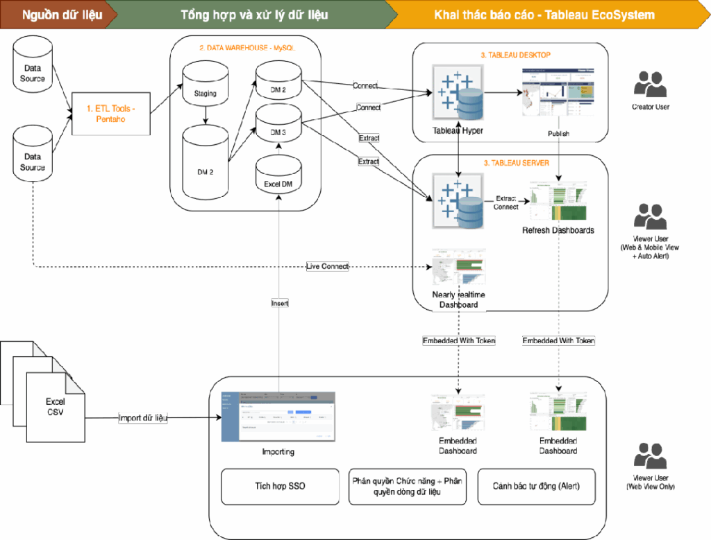 - Tích hợp dữ liệu từ các hệ thống nguồn thông qua các phương thức API và ETL (Tibco, Pentaho, Kafka, Nifi,…)