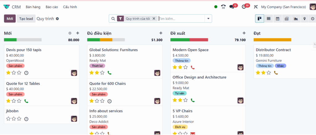 Bên cạnh đó, Odoo CRM hỗ trợ doanh nghiệp phân tích dữ liệu trực quan và đưa ra báo cáo realtime, giúp nhà quản trị nhanh chóng nắm bắt tình hình kinh doanh, dự báo doanh số và ra quyết định chính xác hơn. Không chỉ tối ưu hiệu quả nội bộ, hệ thống còn giúp doanh nghiệp nâng cao trải nghiệm khách hàng, tạo sự hài lòng, xây dựng niềm tin và duy trì mối quan hệ gắn bó lâu dài. Tất cả những yếu tố này góp phần tạo nên lợi thế cạnh tranh bền vững, thúc đẩy tăng trưởng doanh thu ổn định và giúp doanh nghiệp tự tin mở rộng quy mô trong kỷ nguyên số.