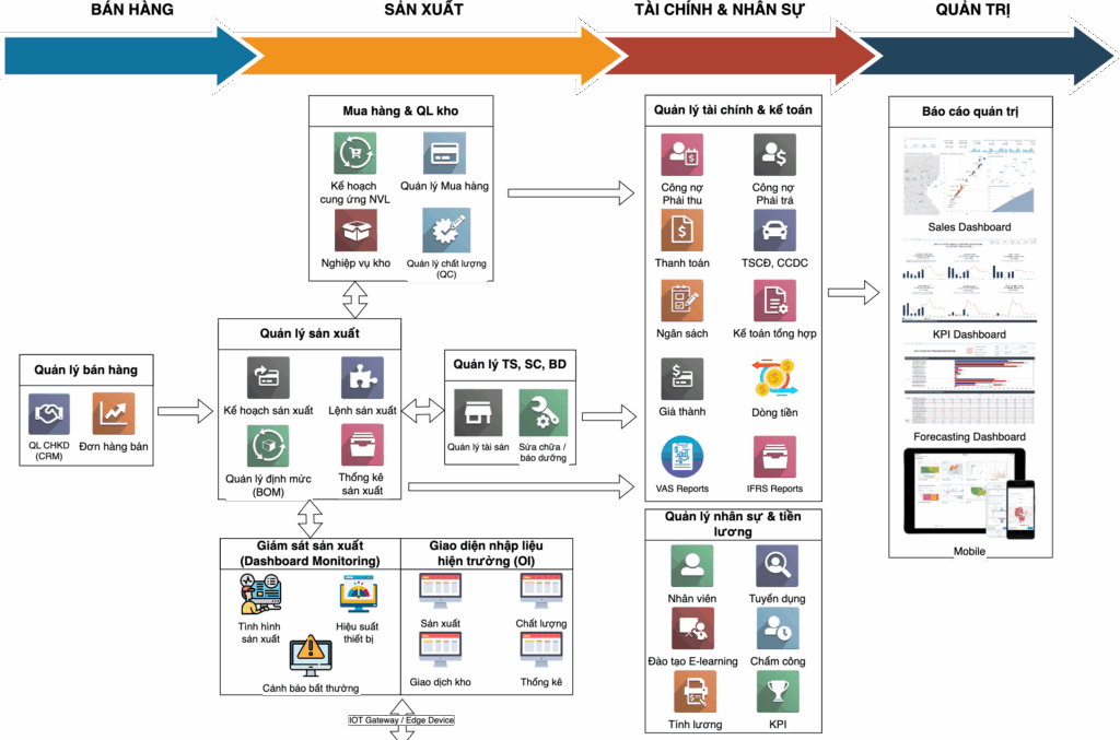Manufacturing Execution System (MES) – Hệ thống điều hành sản xuất là giải pháp số giúp doanh nghiệp giám sát và kiểm soát toàn bộ quy trình sản xuất theo thời gian thực. MES đóng vai trò như “cầu nối” giữa hệ thống hoạch định nguồn lực (ERP) và hoạt động sản xuất tại nhà máy, đảm bảo sự liên thông từ lập kế hoạch, vận hành, kiểm soát chất lượng cho đến bảo trì thiết bị.
